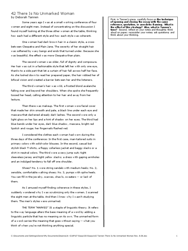 There Is No Unmarked Women. Deborah tannen’s “there is no unmarked woman” exemplifies how normal it is in this society for women to be superficially judged and “marked” on the basis of appearance. 'there is no unmarked women' by deborah tannen men's style are unmarked but women's styles are marked the idea of genderlects, if or not that period is utilised, extends to supply an lighting limelight on certain kinds of dialect phenomena that are assessed for gender.